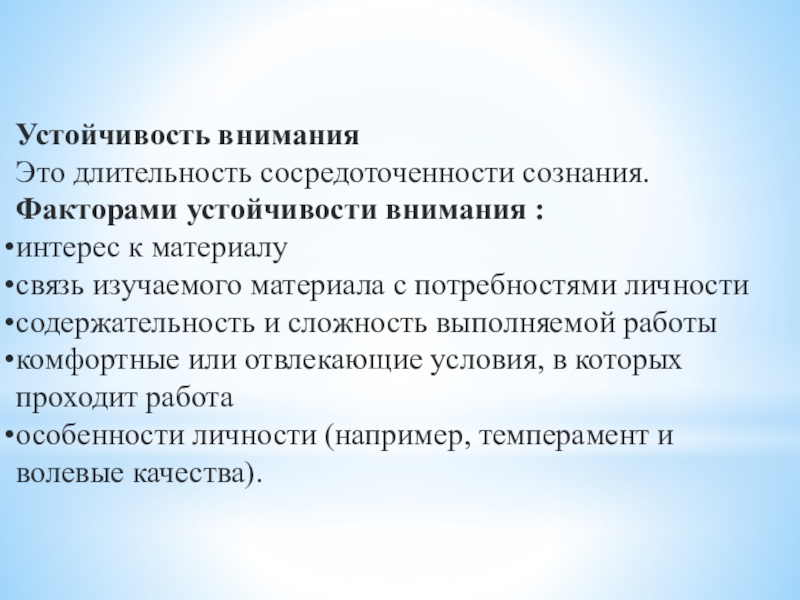 Это длительность сосредоточенности сознания. Факторами устойчивости внимания :