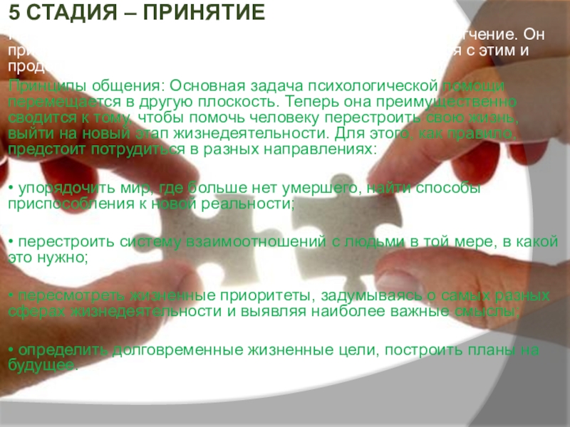 Принципы общения: Основная задача психологической помощи перемещается в другую плоскость. Теперь она преимущественно сводится к тому, чтобы помочь человеку перестроить свою жизнь, выйти на новый этап жизнедеятельности. Для этого, как правило, предстоит потрудиться в разных направлениях: