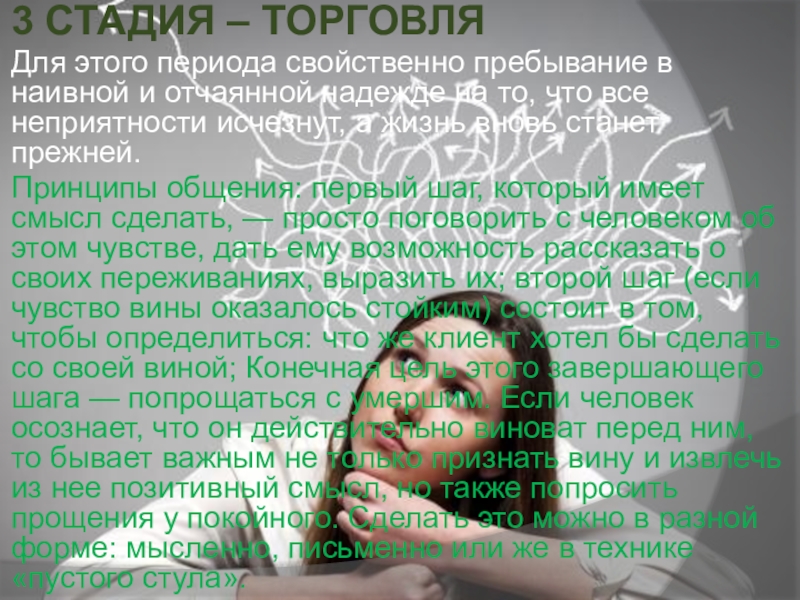 Принципы общения: первый шаг, который имеет смысл сделать, — просто поговорить с человеком об этом чувстве, дать ему возможность рассказать о своих переживаниях, выразить их; второй шаг (если чувство вины оказалось стойким) состоит в том, чтобы определиться: что же клиент хотел бы сделать со своей виной; Конечная цель этого завершающего шага — попрощаться с умершим. Если человек осознает, что он действительно виноват перед ним, то бывает важным не только признать вину и извлечь из нее позитивный смысл, но также попросить прощения у покойного. Сделать это можно в разной форме: мысленно, письменно или же в технике «пустого стула».