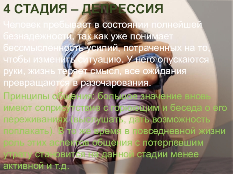 Принципы общения: большое значение вновь имеют соприсутствие с горюющим и беседа о его переживаниях (выслушать, дать возможность поплакать). В то же время в повседневной жизни роль этих аспектов общения с потерпевшим утрату становится на данной стадии менее активной и т.д.