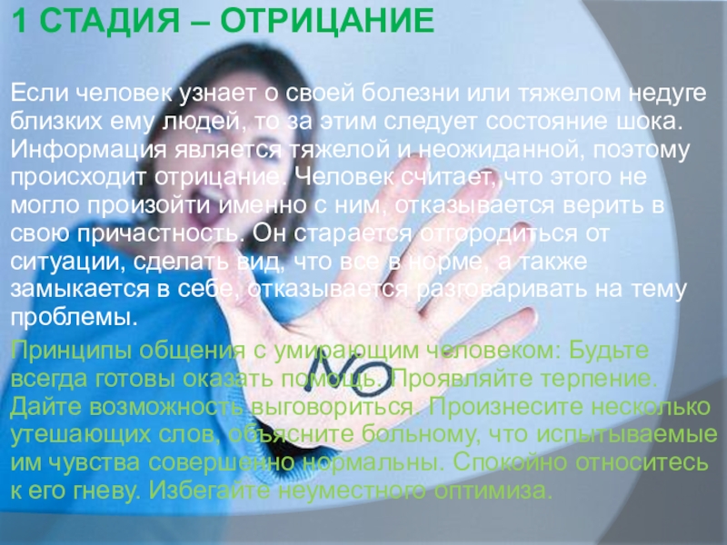 недуге близких ему людей, то за этим следует состояние шока. Информация является тяжелой и неожиданной, поэтому происходит отрицание. Человек считает, что этого не могло произойти именно с ним, отказывается верить в свою причастность. Он старается отгородиться от ситуации, сделать вид, что все в норме, а также замыкается в себе, отказывается разговаривать на тему проблемы.