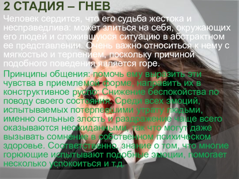 Принципы общения: помочь ему выразить эти чувства в приемлемой форме, направить их в конструктивное русло; Снижение беспокойства по поводу своего состояния. Среди всех эмоций, испытываемых потерпевшими утрату людьми, именно сильные злость и раздражение чаще всего оказываются неожиданными, так что могут даже вызывать сомнение в собственном психическом здоровье. Соответственно, знание о том, что многие горюющие испытывают подобные эмоции, помогает несколько успокоиться и т.д.