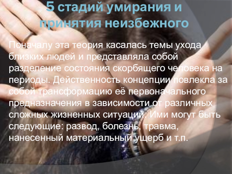 близких людей и представляла собой разделение состояния скорбящего человека на периоды. Действенность концепции повлекла за собой трансформацию её первоначального предназначения в зависимости от различных сложных жизненных ситуаций. Ими могут быть следующие: развод, болезнь, травма, нанесенный материальный ущерб и т.п.