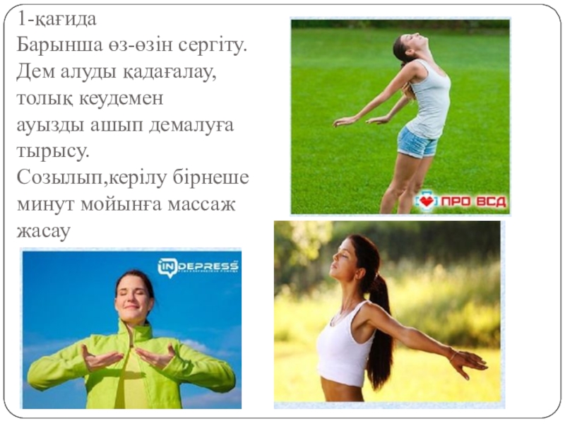 1-қағида Барынша өз-өзін сергіту. Дем алуды қадағалау,толық кеудемен ауызды ашып демалуға тырысу. Созылып,керілу бірнеше минут мойынға массаж