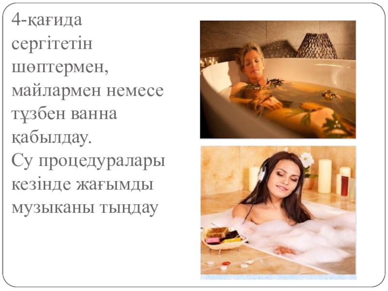 Слайд 114-қағида сергітетін шөптермен,майлармен немесе тұзбен ванна қабылдау. Су процедуралары кезінде жағымды музыканы тыңдау