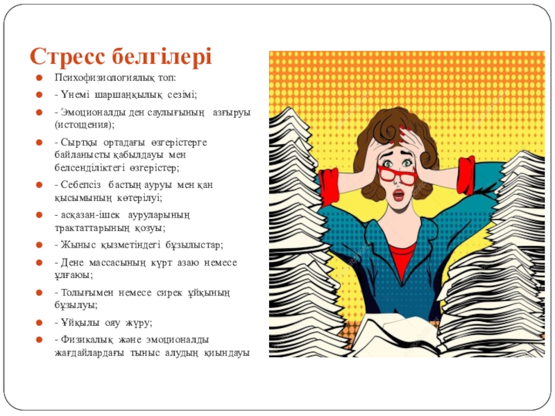 Стресс белгілеріПсихофизиологиялық топ:- Үнемі шаршаңқылық сезімі;- Эмоционалды ден саулығының  азғыруы (истощения);- Сыртқы ортадағы өзгерістерге байланысты қабылдауы
