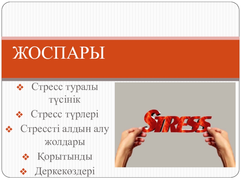 Стресс туралы түсінікСтресс түрлеріСтрессті алдын алу жолдарыҚорытынды Деркекөздері ЖОСПАРЫ