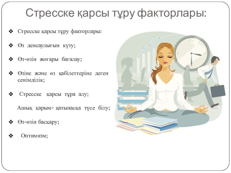Стресске қарсы тұру факторлары: Стресске қарсы тұру факторлары:Өз денсаулығын күту;Өз-өзін жоғары бағалау;Өзіне және өз қабілеттеріне деген сенімділік;