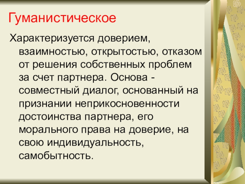 партнера. Основа - совместный диалог, основанный на признании неприкосновенности достоинства партнера, его морального права на доверие, на свою индивидуальность, самобытность.