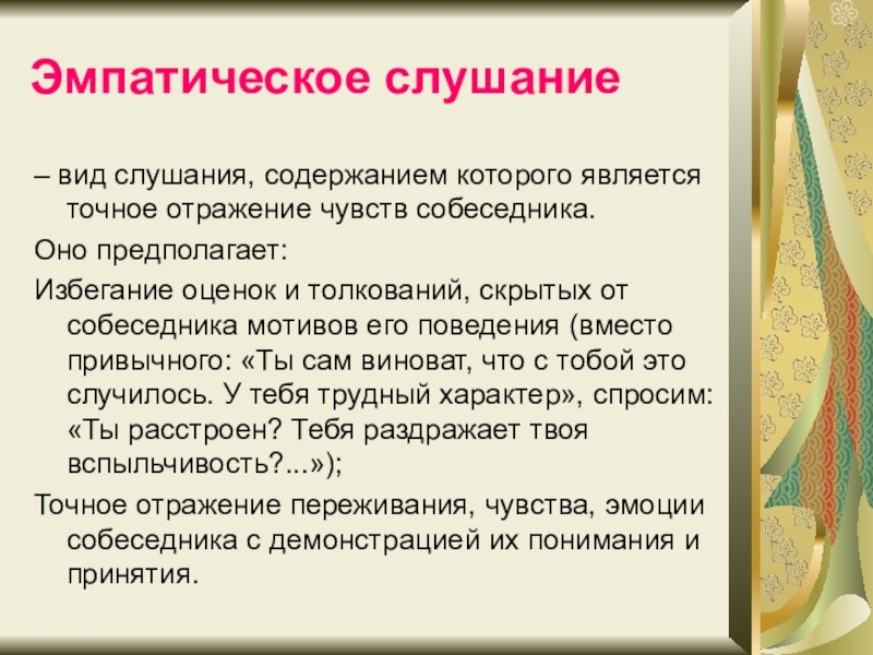 Точное отражение переживания, чувства, эмоции собеседника с демонстрацией их понимания и принятия.