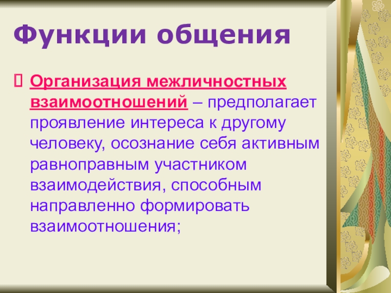 Организация межличностных взаимоотношений – предполагает проявление интереса к другому человеку,