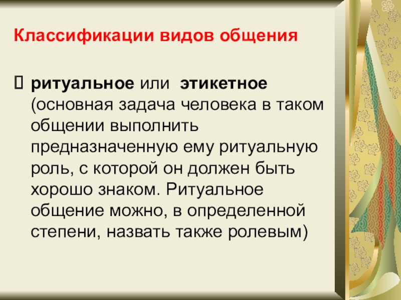 выполнить предназначенную ему ритуальную роль, с которой он должен быть хорошо знаком. Ритуальное общение можно, в определенной степени, назвать также ролевым)