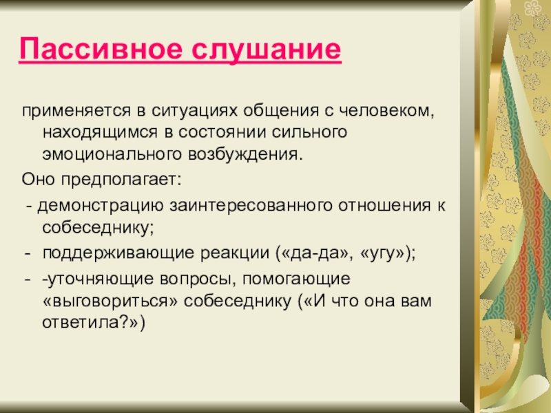 -уточняющие вопросы, помогающие «выговориться» собеседнику («И что она вам ответила?»)
