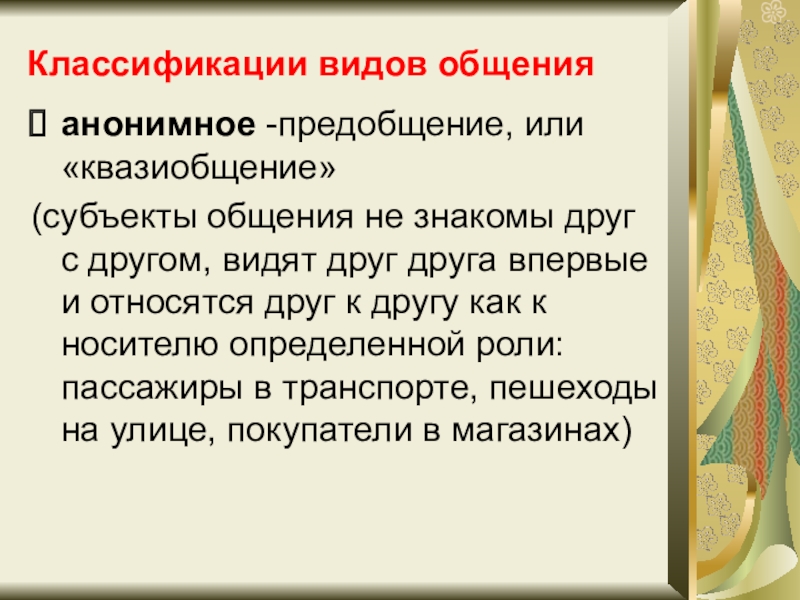 другом, видят друг друга впервые и относятся друг к другу как к носителю определенной роли: пассажиры в транспорте, пешеходы на улице, покупатели в магазинах)