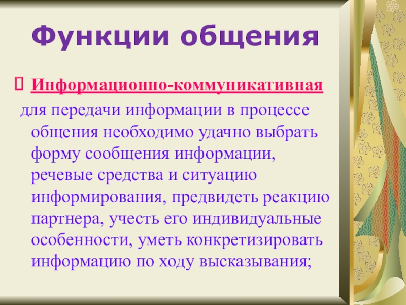 выбрать форму сообщения информации, речевые средства и ситуацию информирования, предвидеть реакцию партнера, учесть его индивидуальные особенности, уметь конкретизировать информацию по ходу высказывания;