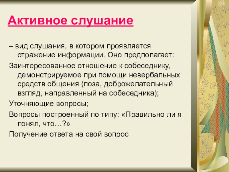 Заинтересованное отношение к собеседнику, демонстрируемое при помощи невербальных средств общения (поза, доброжелательный взгляд, направленный на собеседника);