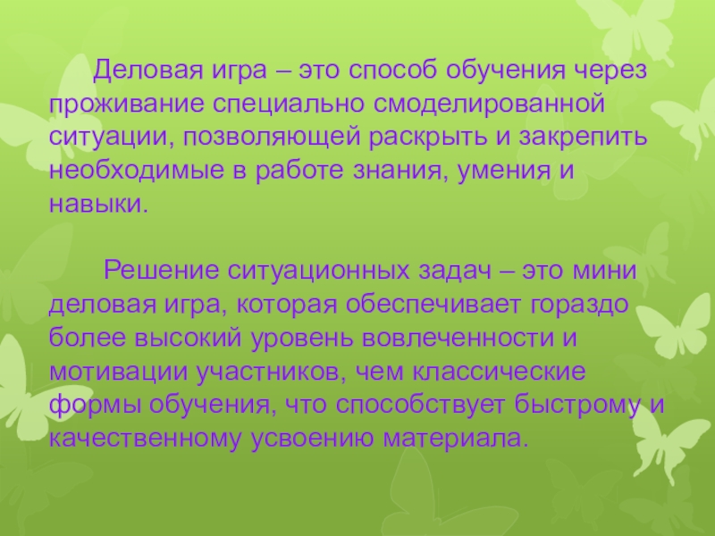 Решение ситуационных задач – это мини деловая игра, которая обеспечивает гораздо более высокий уровень вовлеченности и мотивации участников, чем классические формы обучения, что способствует быстрому и качественному усвоению материала.