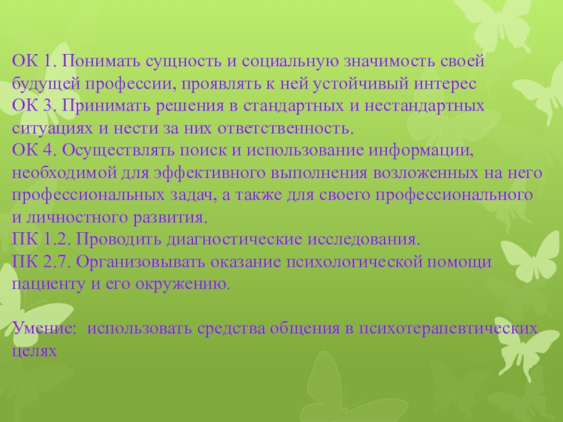 Слайд 7ОК 1. Понимать сущность и социальную значимость своей будущей профессии, проявлять к ней