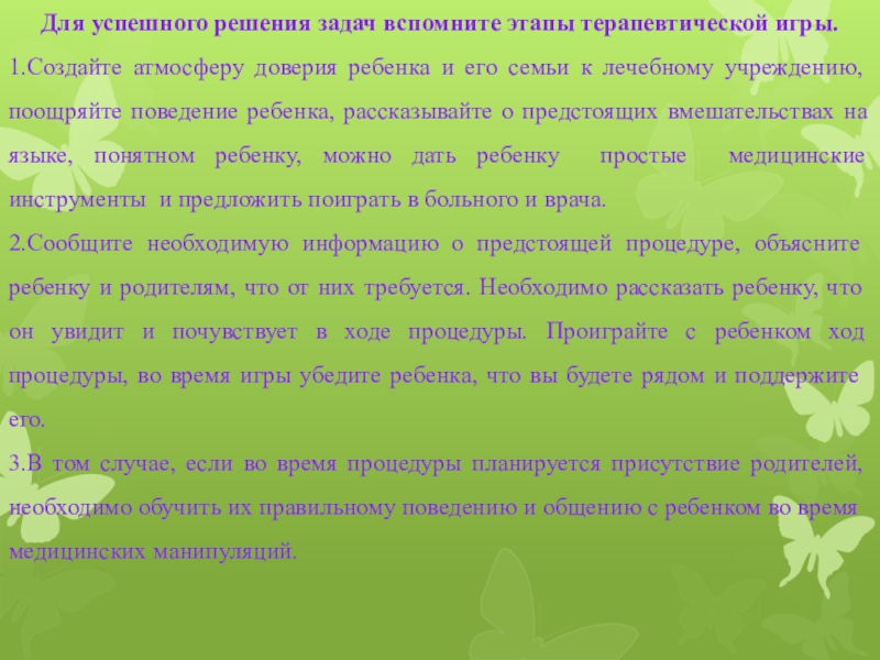 Для успешного решения задач вспомните этапы терапевтической игры.