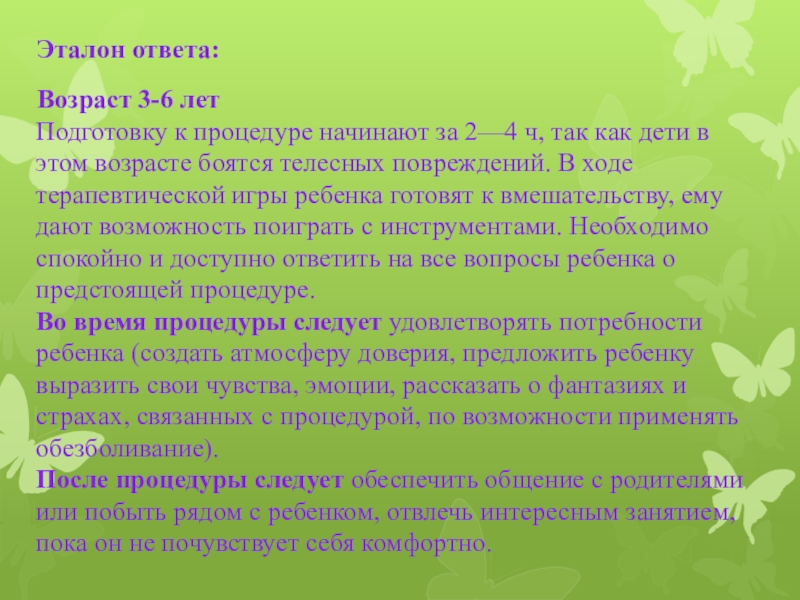 так как дети в этом возрасте боятся телесных повреждений. В ходе терапевтической игры ребенка готовят к вмешательству, ему дают возможность поиграть с инструментами. Необходимо спокойно и доступно ответить на все вопросы ребенка о предстоящей процедуре.