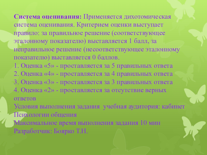 Система оценивания: Применяется дихотомическая система оценивания. Критерием оценки выступает правило: за