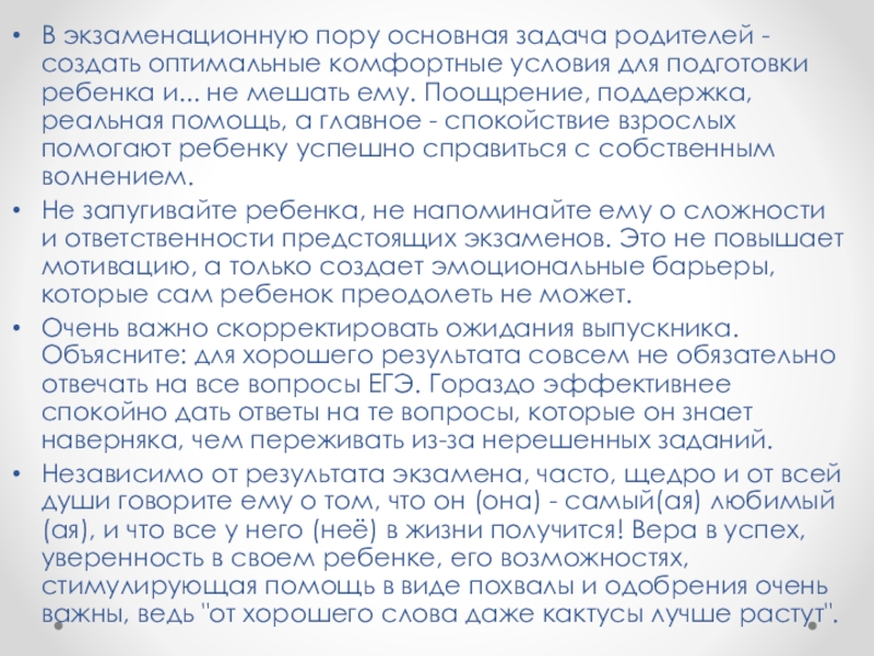 Слайд 8В экзаменационную пору основная задача родителей - создать оптимальные комфортные условия