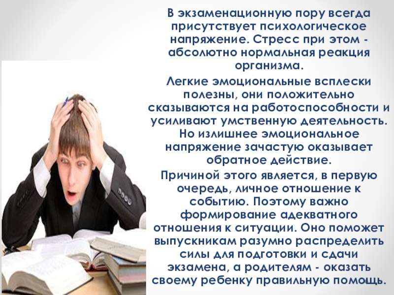 Слайд 2В экзаменационную пору всегда присутствует психологическое напряжение. Стресс при этом -