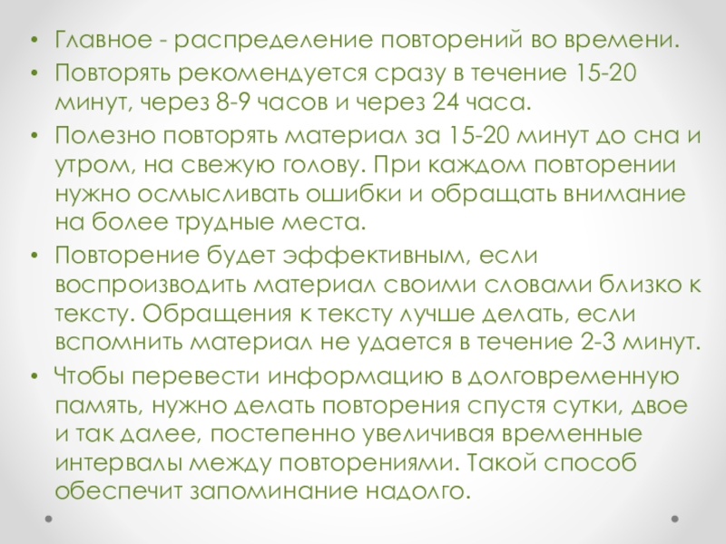 Повторение будет эффективным, если воспроизводить материал своими словами близко к тексту. Обращения к тексту лучше делать, если вспомнить материал не удается в течение 2-3 минут.