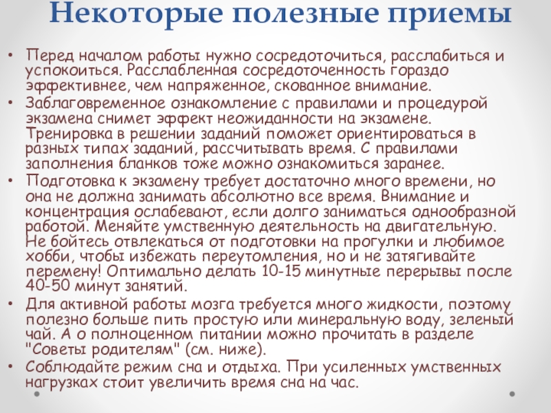 Заблаговременное ознакомление с правилами и процедурой экзамена снимет эффект неожиданности на экзамене. Тренировка в решении заданий поможет ориентироваться в разных типах заданий, рассчитывать время. С правилами заполнения бланков тоже можно ознакомиться заранее.