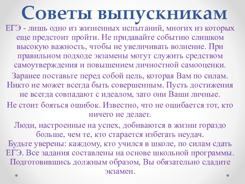 еще предстоит пройти. Не придавайте событию слишком высокую важность, чтобы не увеличивать волнение. При правильном подходе экзамены могут служить средством самоутверждения и повышением личностной самооценки.