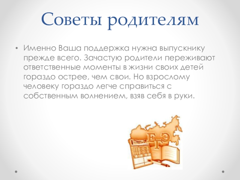 Именно Ваша поддержка нужна выпускнику прежде всего. Зачастую родители переживают