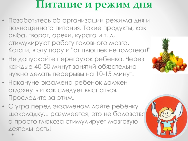 Для активной работы мозга требуется много жидкости, поэтому полезно больше пить простую или минеральную воду, зеленый чай. А о полноценном питании можно прочитать в разделе "Советы родителям" (см. ниже).