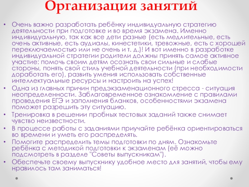 Очень важно разработать ребёнку индивидуальную стратегию деятельности при подготовке и