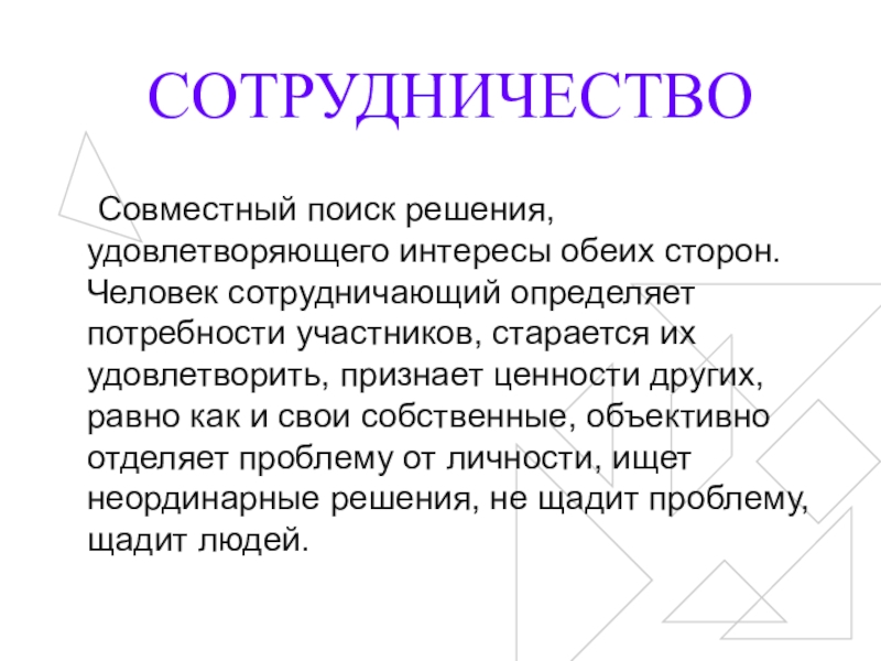 Совместный поиск решения, удовлетворяющего интересы обеих сторон. Человек сотрудничающий определяет потребности