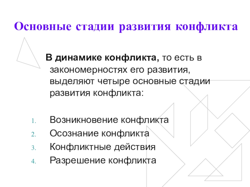 развития, выделяют четыре основные стадии развития конфликта: