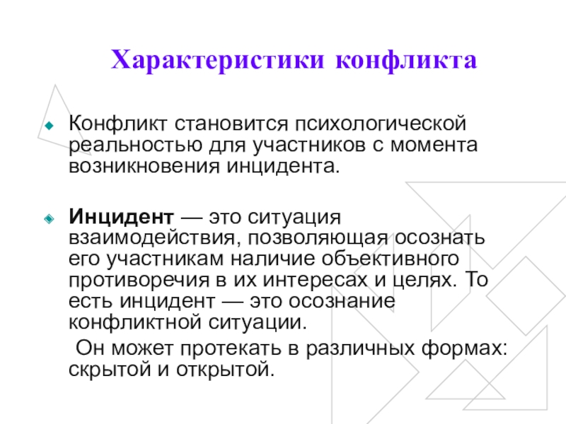 Инцидент — это ситуация взаимодействия, позволяющая осознать его участникам наличие объективного противоречия в их интересах и целях. То есть инцидент — это осознание конфликтной ситуации.