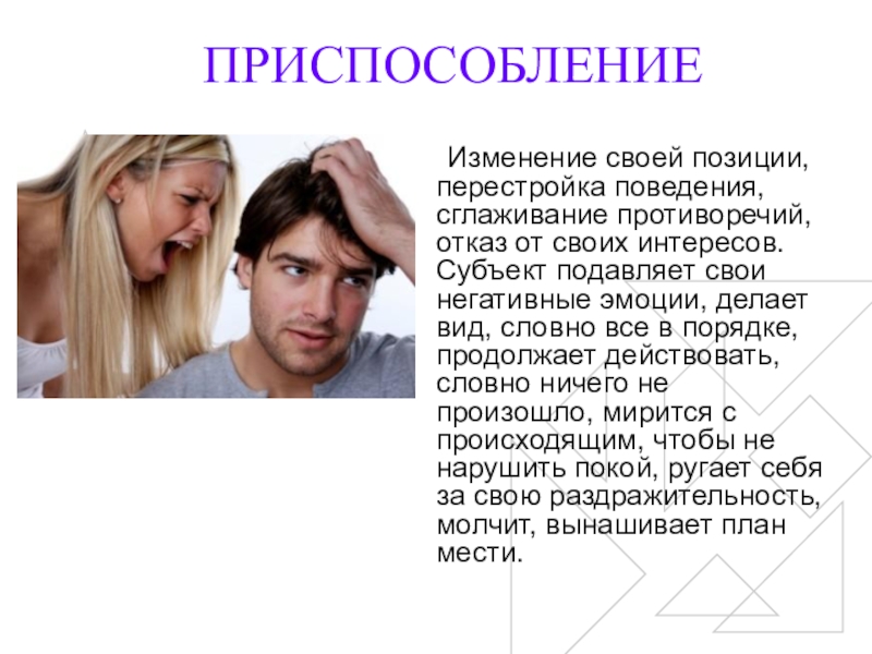 Изменение своей позиции, перестройка поведения, сглаживание противоречий, отказ от своих интересов.