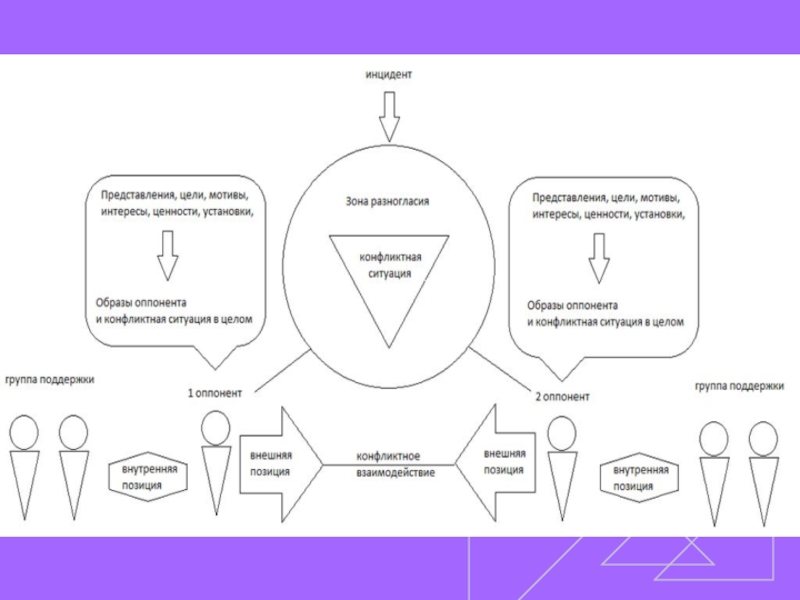 Стороны конфликта (оппоненты, участники) - отдельные люди или группы людей. Для сторон характерно наличие у них внешней и внутренней позиции в конфликте.