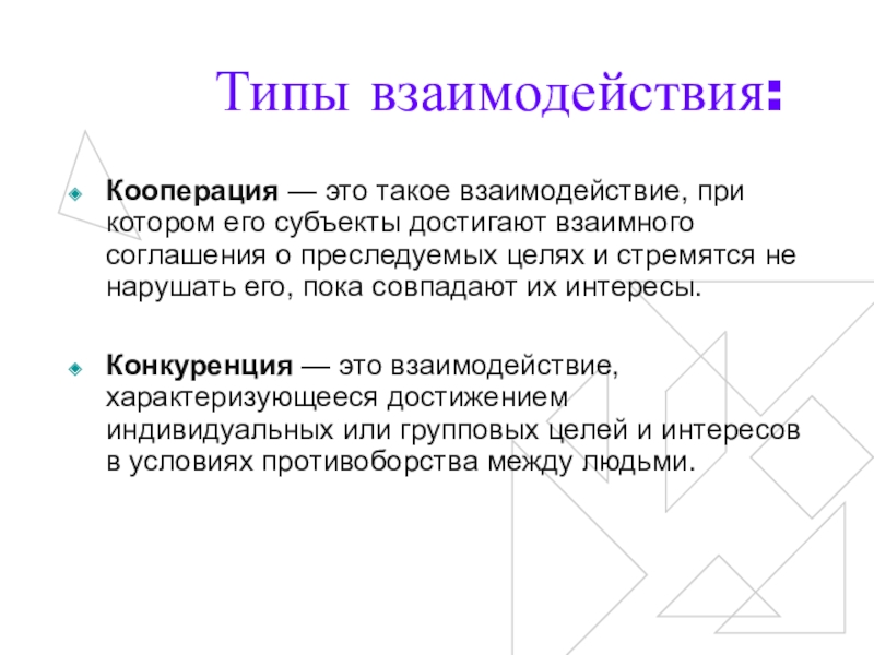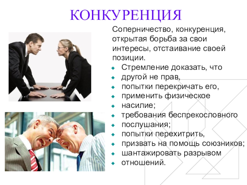 Конкуренция — это взаимодействие, характеризующееся достижением индивидуальных или групповых целей и интересов в условиях противоборства между людьми.