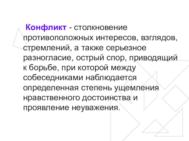 Слайд 10 Конфликт - столкновение противоположных интересов, взглядов, стремлений, а также серьезное разногласие,