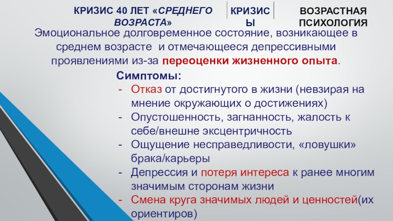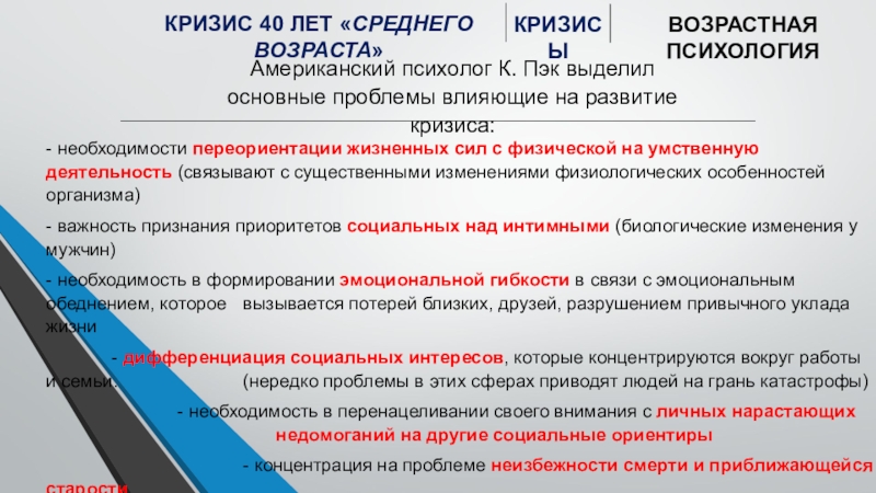 Американский психолог К. Пэк выделил основные проблемы влияющие на развитие кризиса: