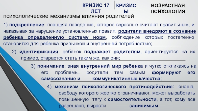 Сопровождается типичными поведенческими реакциями: «пренебрежительное отношение» к советам старших, недоверие и критиканство по отношению к старшим поколениям, иногда даже открытое противодействие.