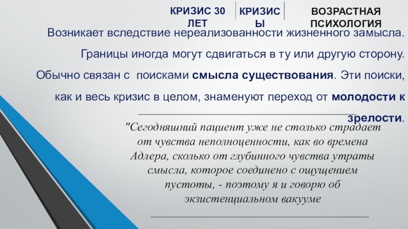 "на границе третьего десятилетия своей жизни самоанализ имеет особое значение... Оглядываясь на пройденный путь, на свои достижения и провалы, он видит, как при уже сложившейся и внешне благополучной жизни несовершенна его личность. Как мало сделано, хотя пройден уже изрядный отрезок жизненного пути, как много времени и сил потрачено "напрасно", насколько мало он реализовал свои способности и возможности... Происходит переоценка ценностей, влекущая за собой самоанализ и критический пересмотр собственной личности"