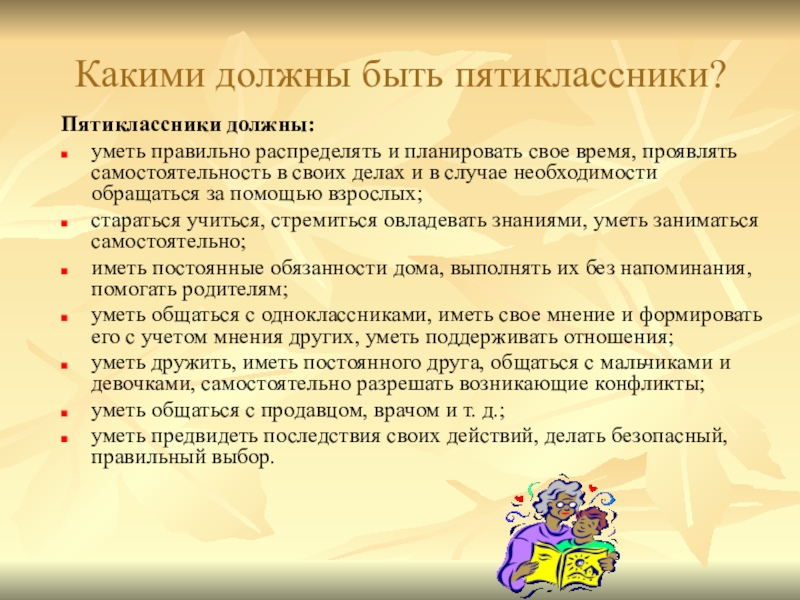 Какими должны быть пятиклассники?Пятиклассники должны:уметь правильно распределять и планировать свое время, проявлять самостоятельность в своих делах и