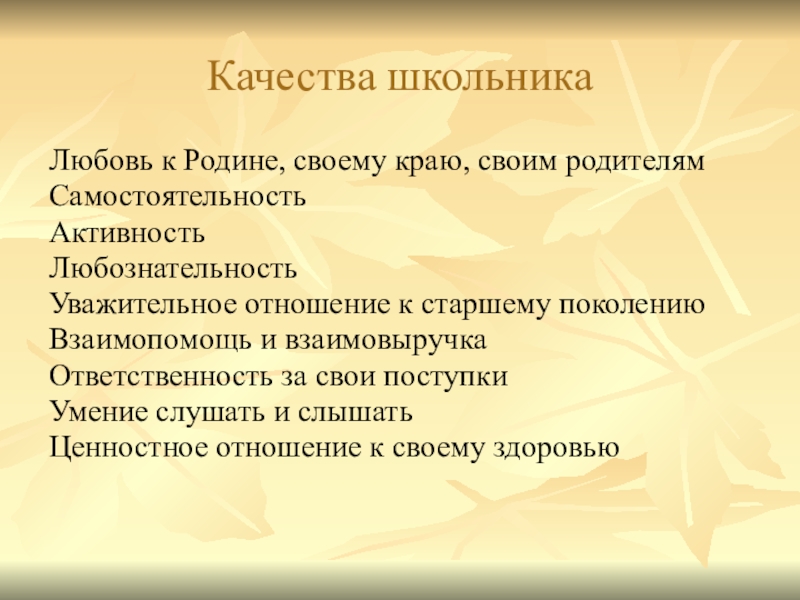 Качества школьникаЛюбовь к Родине, своему краю, своим родителямСамостоятельностьАктивностьЛюбознательностьУважительное отношение к старшему поколениюВзаимопомощь и взаимовыручкаОтветственность за свои поступкиУмение