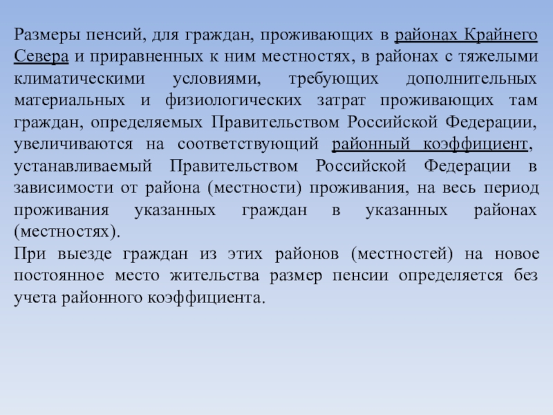 к ним местностях, в районах с тяжелыми климатическими условиями, требующих дополнительных материальных и физиологических затрат проживающих там граждан, определяемых Правительством Российской Федерации, увеличиваются на соответствующий районный коэффициент, устанавливаемый Правительством Российской Федерации в зависимости от района (местности) проживания, на весь период проживания указанных граждан в указанных районах (местностях).