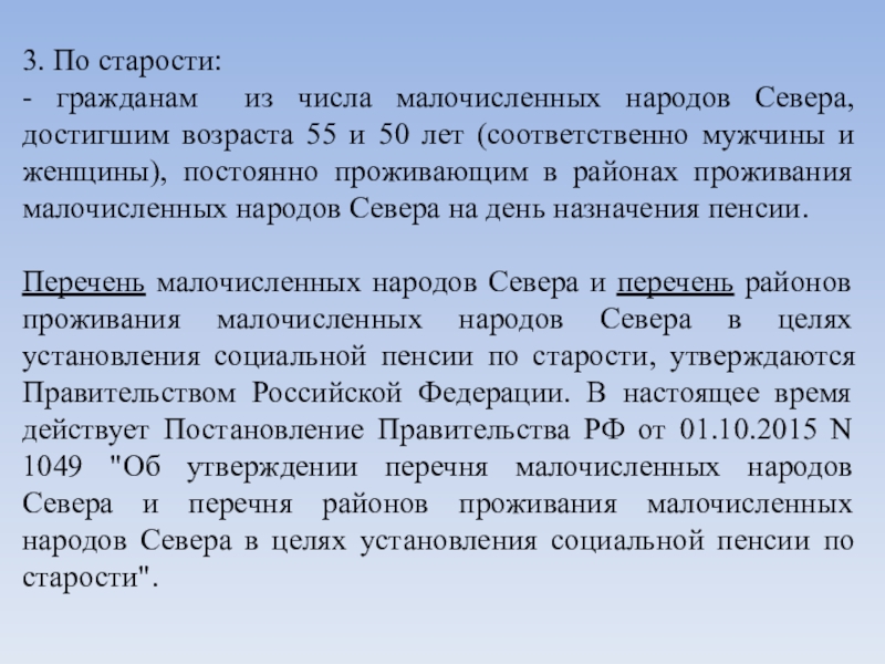 Перечень малочисленных народов Севера и перечень районов проживания малочисленных народов Севера в целях установления социальной пенсии по старости, утверждаются Правительством Российской Федерации. В настоящее время действует Постановление Правительства РФ от 01.10.2015 N 1049 "Об утверждении перечня малочисленных народов Севера и перечня районов проживания малочисленных народов Севера в целях установления социальной пенсии по старости".