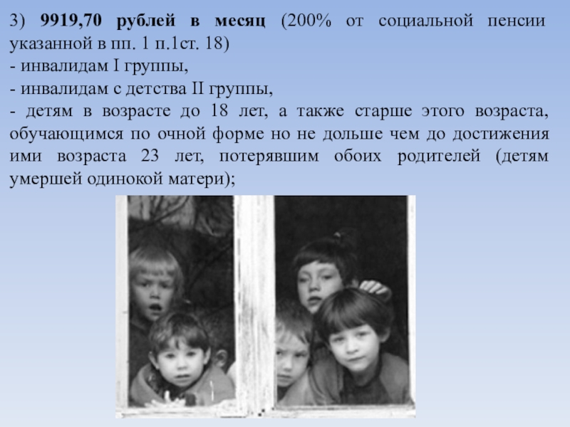 Слайд 153) 9919,70 рублей в месяц (200% от социальной пенсии указанной в