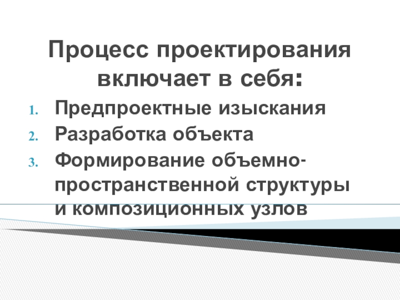 Процесс проектирования включает в себя: Предпроектные изысканияРазработка объектаФормирование объемно-пространственной структуры и композиционных узлов