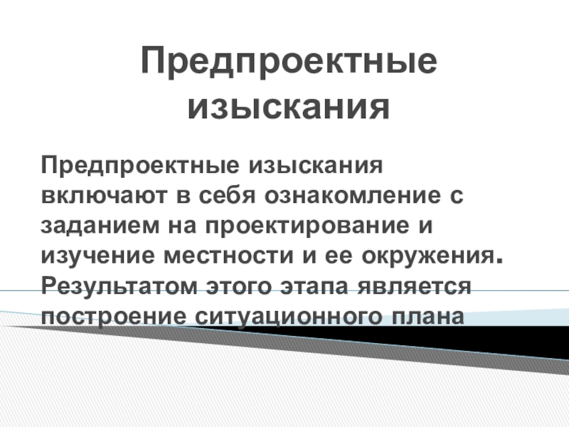 Предпроектные изысканияПредпроектные изыскания включают в себя ознакомление с заданием на проектирование и изучение местности и ее окружения.